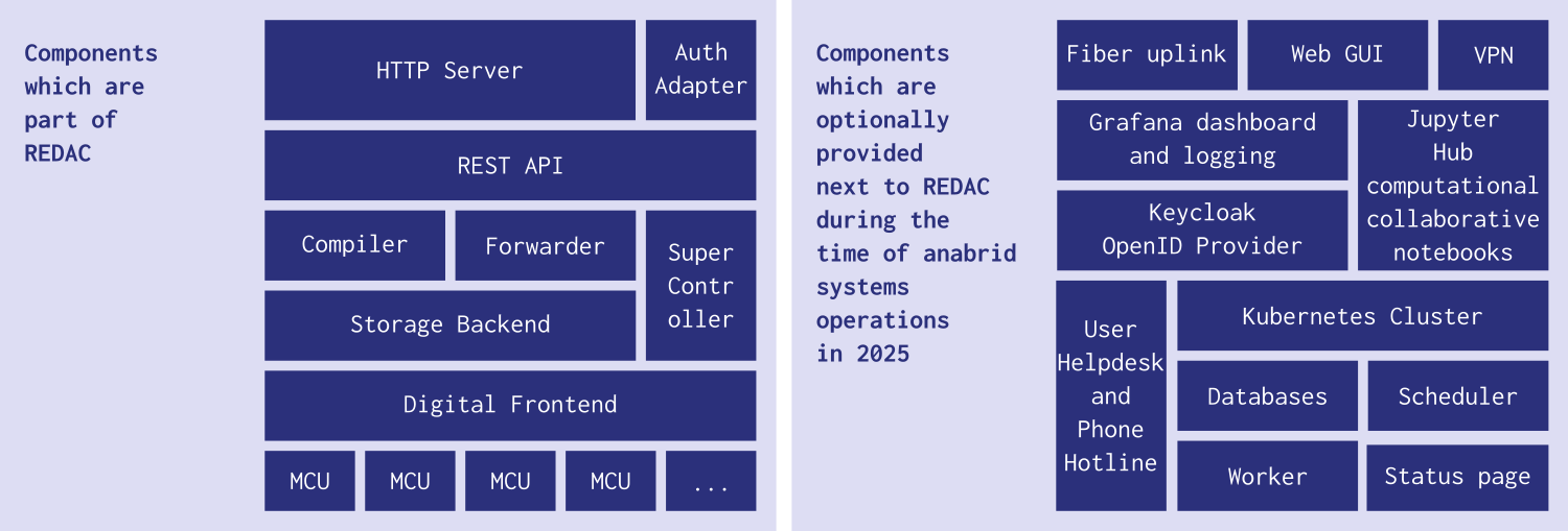 The following services are not part of REDAC but part of the operations teams, next to the actual REDAC hardware and software maintenance. Similar systems are supposed to be hosted by a REDAC customer. See also figure Overview about the REDAC-internal services vs. the services operated by anabrid. Click to enlarge. for an overview.